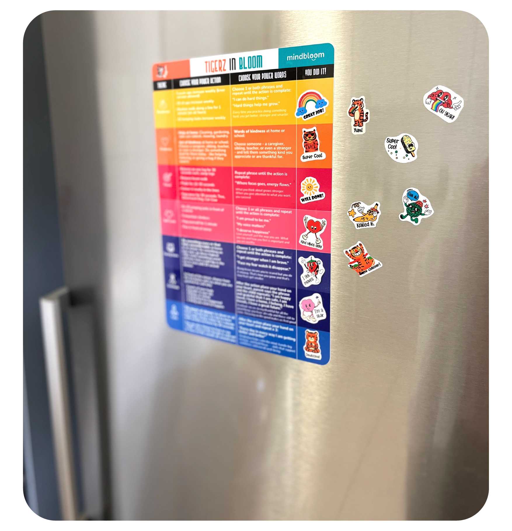 The Tigerz in Bloom Reward Board is a tool created in collaboration with Mindbloom and Tumbling Tigerz, designed to help kids build confidence and strength in both mind and body.